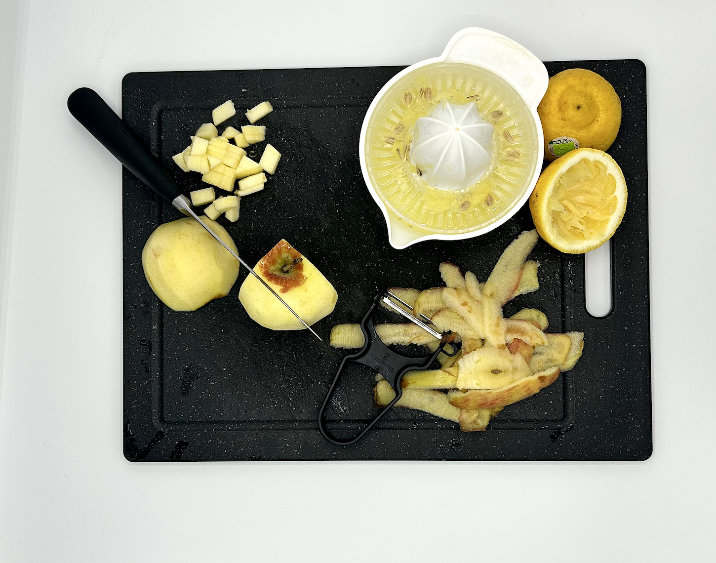 - Äpfel schälen, vierteln, entkernen und in Stücke schneiden