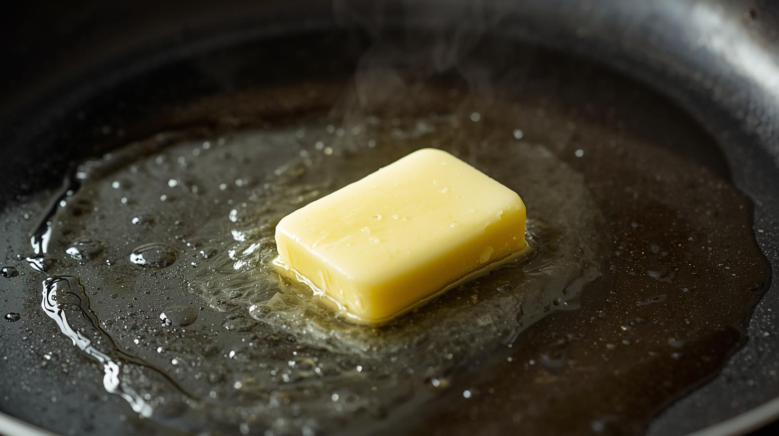 - Währenddessen die Hälfte der Butter in einer beschichteten Pfannen zerfließen lassen. Rosinen abgießen.
